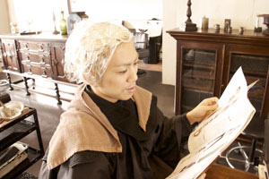 完成したカーテンを手に取り、後輩の手柄を横取りし、「出来る女」を演じるフタカ!(笑)